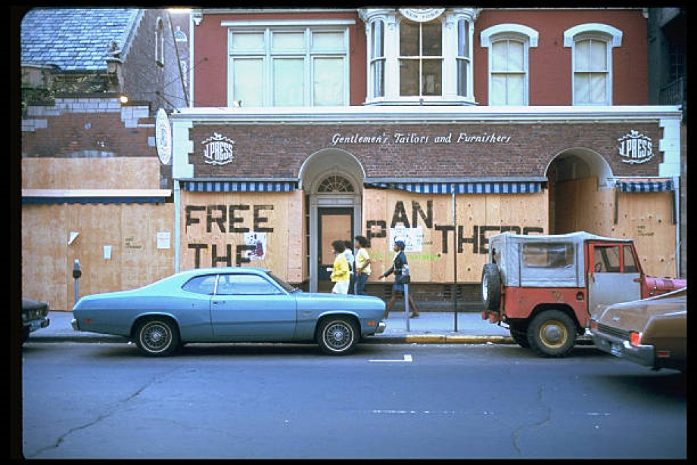 "The bar area and the dining room are next to one another and are of approximately equal size. The furnishings in each were selected to conform to the general character of the spaces. A large brass chandelier hangs over the brick bar. The paneling and stained glass in the dining room were existing and restored to their original condition."
