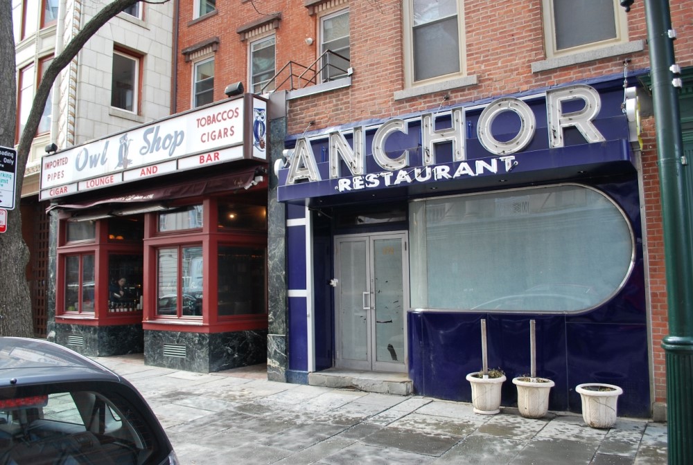 "The bar area and the dining room are next to one another and are of approximately equal size. The furnishings in each were selected to conform to the general character of the spaces. A large brass chandelier hangs over the brick bar. The paneling and stained glass in the dining room were existing and restored to their original condition."